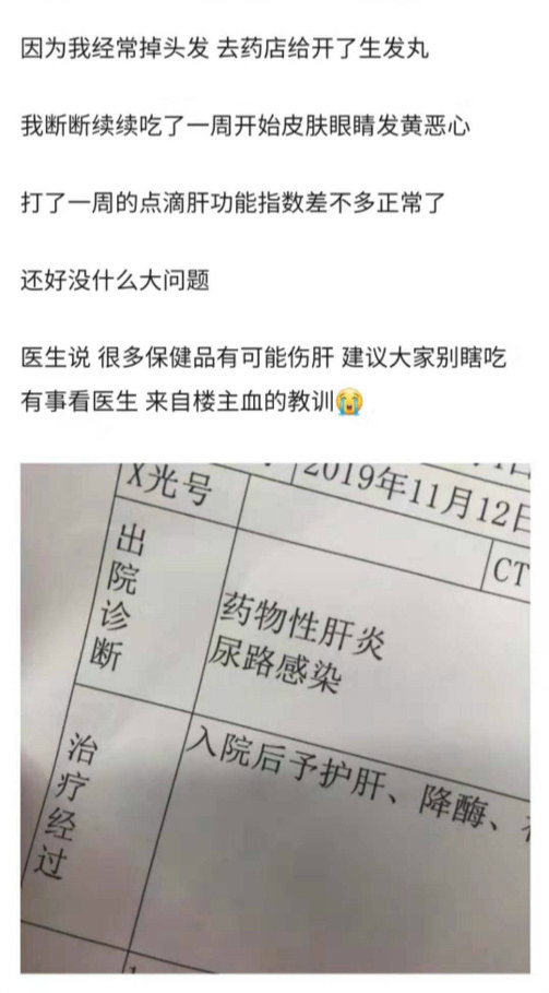 前几天,一位网友在网上发了个帖子,她为了治疗脱发,去药店买了生发丸,吃了一周后开始出现皮肤、眼睛发黄,犯恶心等症状。去医院检查后,医生诊断为何首乌中毒引起的肝损伤,她打了一周的点滴肝功能指数情况才有所好转。