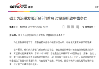 崔阿姨的儿子在硕士研究生毕业前,被查出药物性肝功能异常。随着病情的发展,崔阿姨儿子的肝功能快速衰竭,经北京解放军302医院治疗无效,没多久就去世了。原来,崔阿姨的儿子之前因为脱发问题,在4个月内服用了5.9斤何首乌,对肝功能损害严重。